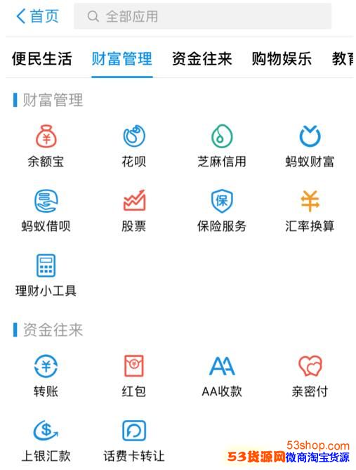2.然后,进入之后,我们可以看到你最近的一些应用。我们不管这些,我们去下面一栏里找财富管理选项。